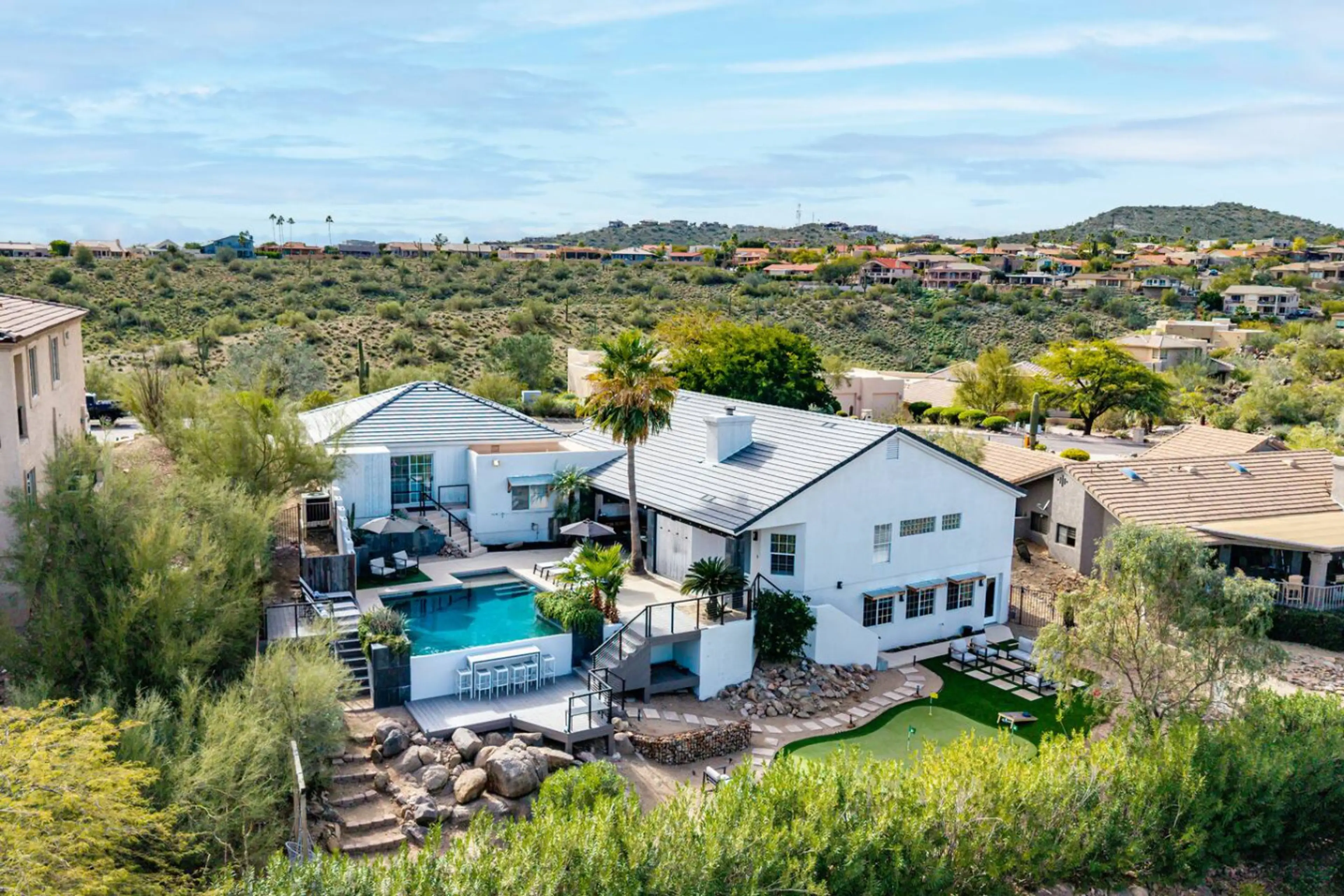 Welcome to PAR19, a luxury 5BR / 4BA, 3,950 sq ft golf-inspired retreat in Fountain Hills with panoramic sunset views, a private putting green, and a resort-style infinity pool. Designed for elevated group stays, this home blends space, entertainment, and location—just minutes from top golf courses ...